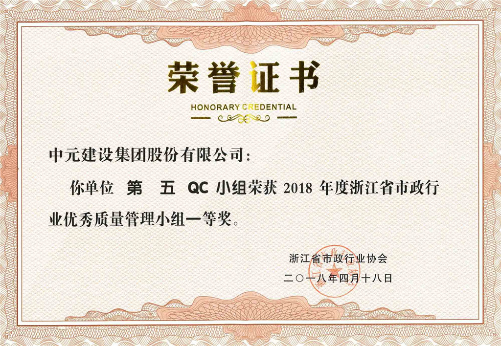 2018年度浙江省市政行业优秀质量管理小组一等奖(第五QC小组)