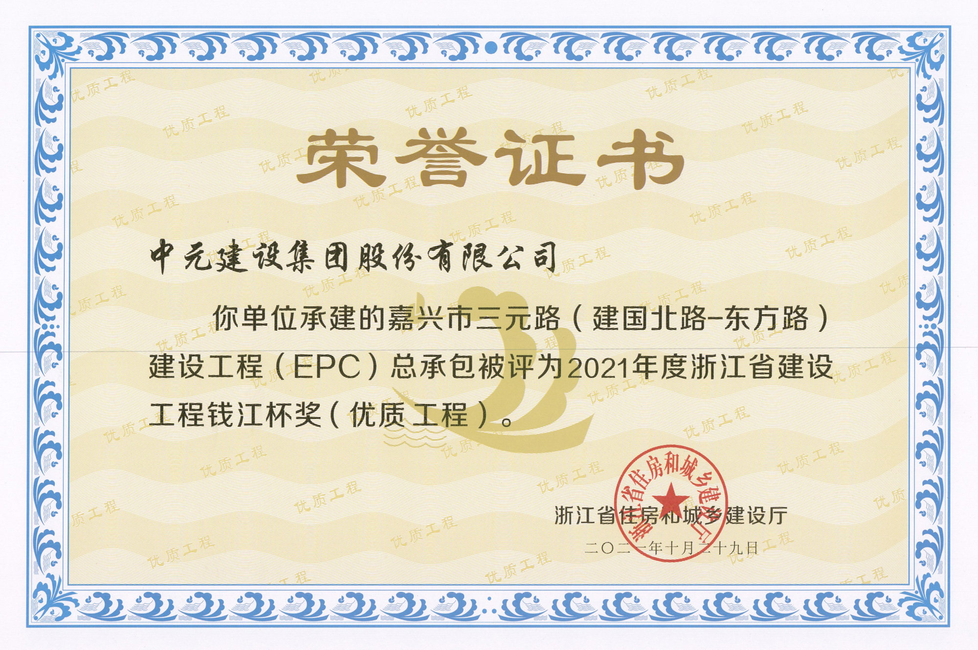 • 2021年度浙江省建设工程钱江杯-嘉兴市三元路(建国北路-东方路)建设工程(EPC)总承包