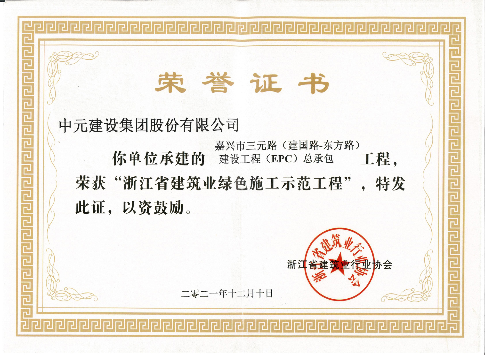 • 2021年度浙江省建筑业绿色施工示范工程(嘉兴市三元路(建国路-东方路)建设工程(EPC)总承包)