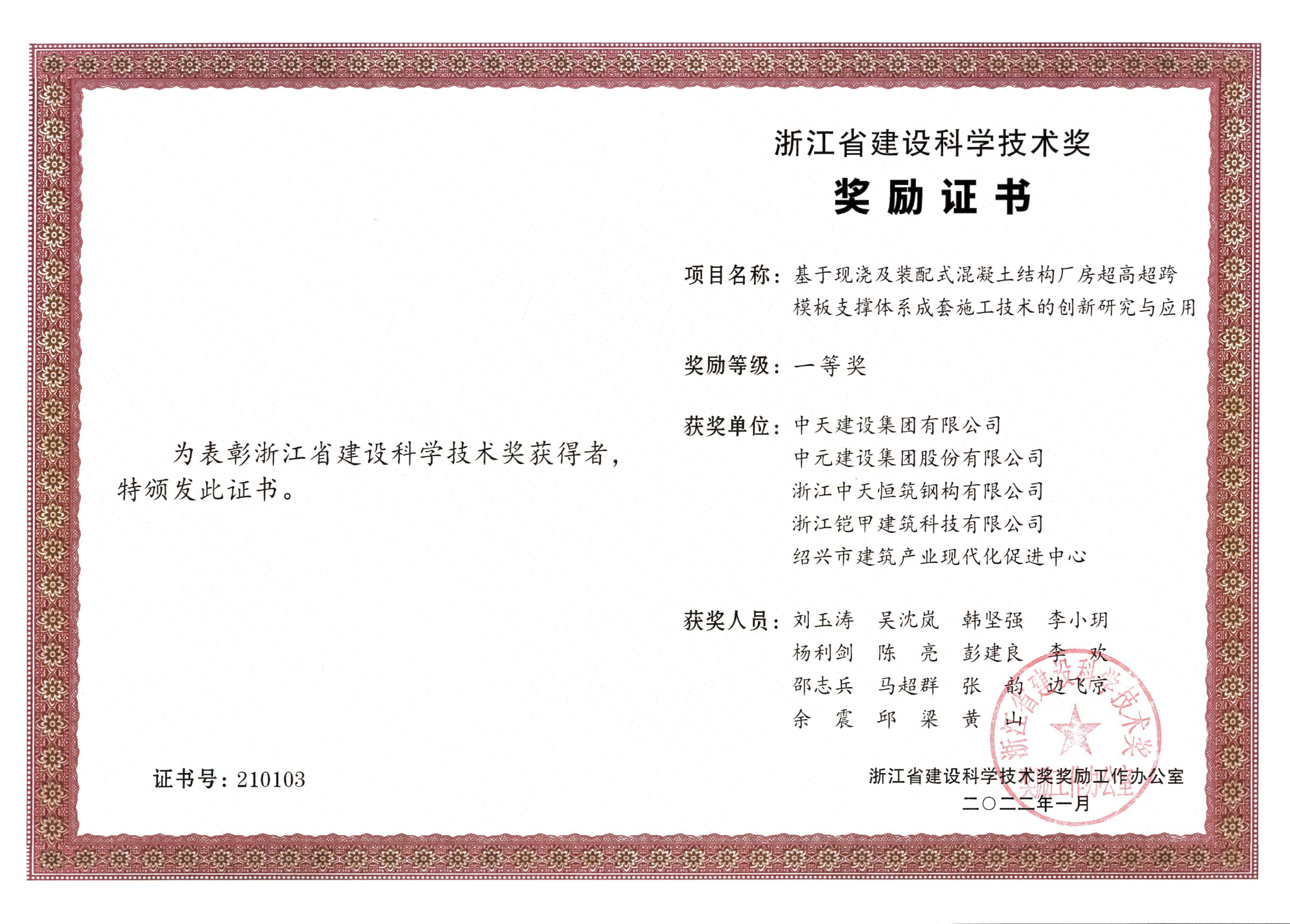 • 2021年浙江省建设科学技术奖(基于现浇及装配式混凝土结构厂房超高超跨模板支撑体系成套施工技术的创新研究与应用)个人